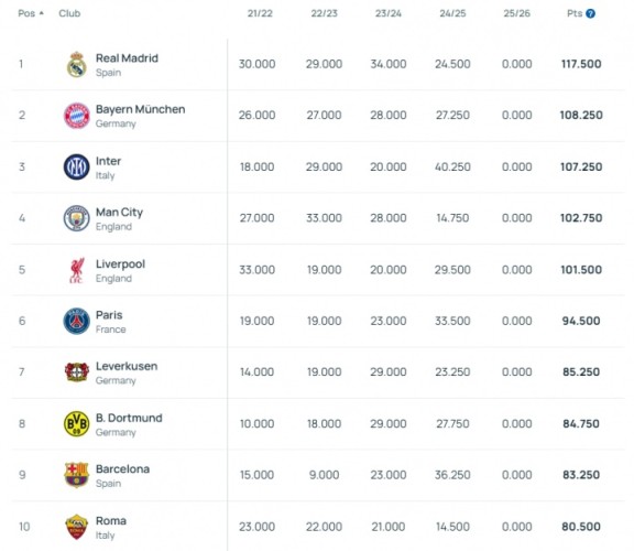 08月13日讯 欧足联于今日公布了25-26赛季最新欧足联系数,其中皇马、拜仁、国米分列前三。