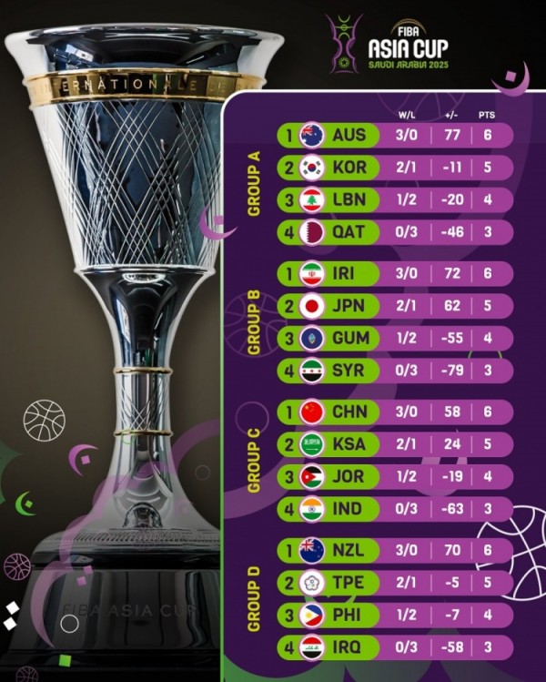 亚洲杯小组赛总结:中澳伊朗新西兰均是全胜战绩 赢分都达到55+