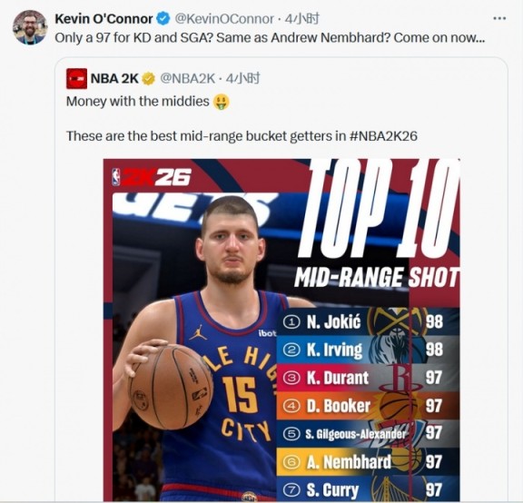 美记点评2K26中投前10:KD和SGA只有97?还和内姆哈德一样?