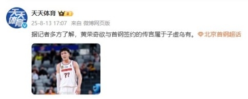 但@天天体育随后跟进报道称:“据记者多方了解,黄荣奇欲与首钢签约的传言属于子虚乌有。”