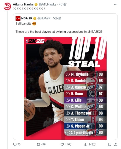 老鹰官推随后还表示:“场均3次抢断应该使你是第一并且能力值是99。”