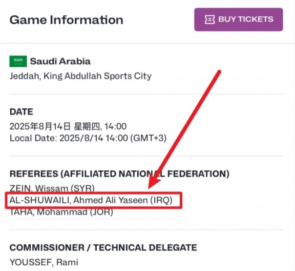 赛前,官方公布了比赛的执裁名单,其中来自伊拉克的裁判AL-SHUWAlLl Ahmed Ali Yaseen在列。