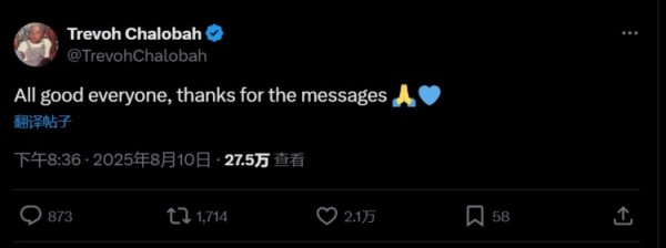 8月11日讯 在切尔西4-1米兰的热身赛中,查洛巴伤退,他在赛后更新社交媒体报平安。查洛巴写道:“一切安好,感谢大家的留言