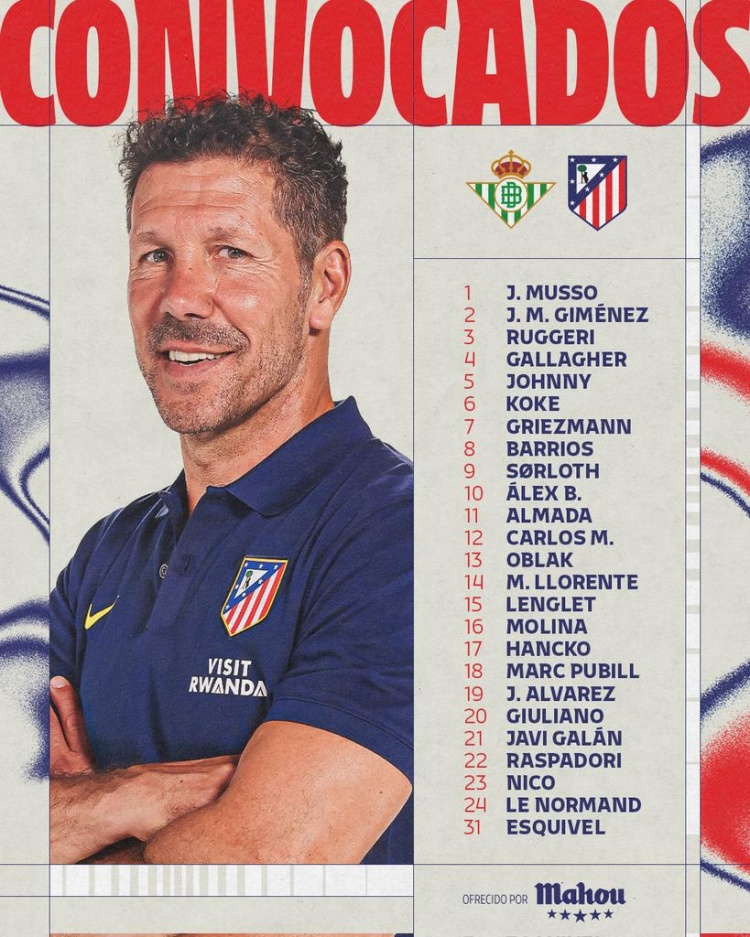 马竞客战贝蒂斯大名单:阿尔瓦雷斯、格列兹曼领衔,卡尔多索回归