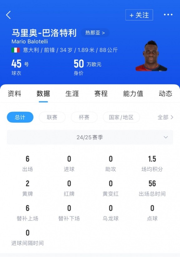 巴洛特利现年34岁,意大利前锋,上赛季他以自由身加盟热那亚,但很难获得出场机会,在仅仅出场6次总计56分钟后,巴洛特利在今夏再次成为自由球员。目前巴洛特利德转身价仅为50万欧元。