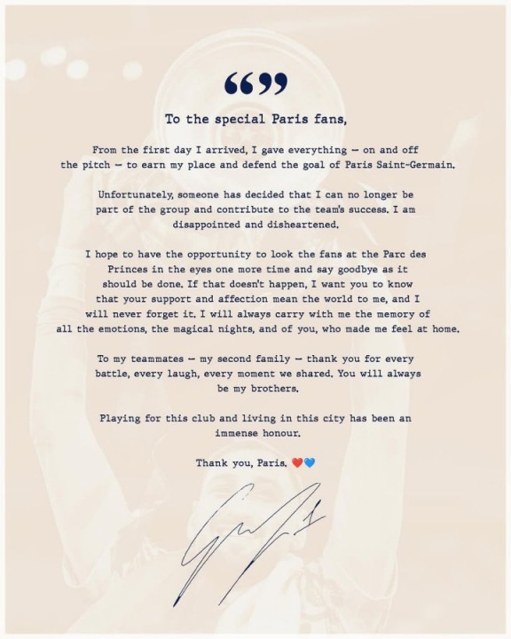 从我抵达的第一天起,我就付出了一切——在场上和场下——只为赢得自己的位置,守护巴黎圣日耳曼的球门。