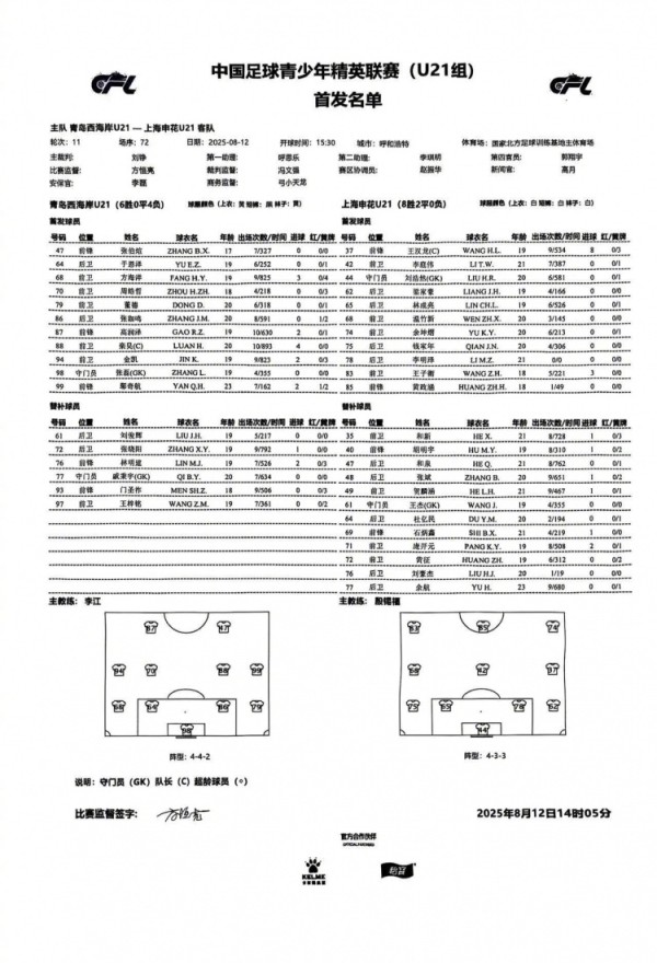 8月12日15:30 ,2025中国足球青少年精英联赛(U21组)第11轮上海申花对阵青岛西海岸的比赛在呼和浩特国家北方足球训练基地进行。