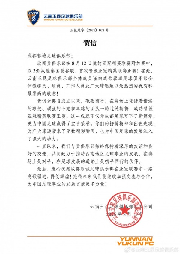 恭喜贵俱乐部成功首次晋级亚冠精英联赛正赛。曾经以为的遥不可及,脚踏实地终会达成,与君共勉,西南崛起!