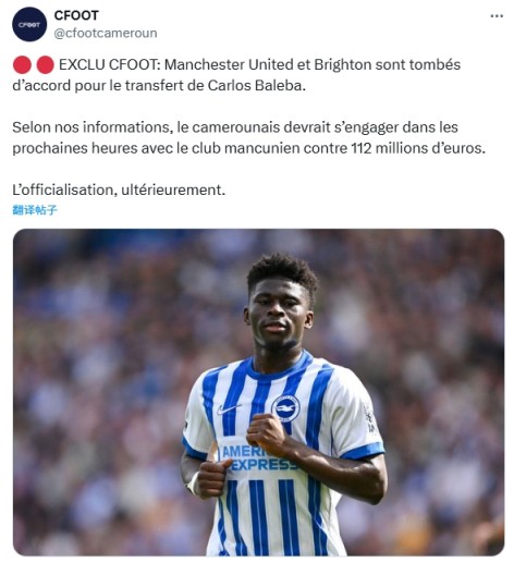 据悉,这名喀麦隆球员将以1.12亿欧元转会费加盟红魔,签约仪式将在未来数小时内完成,具体公告稍后发布。